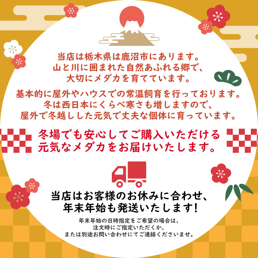 ※通常販売メダカの雄雌の指定や、体型や特徴の指定等はご遠慮ください。